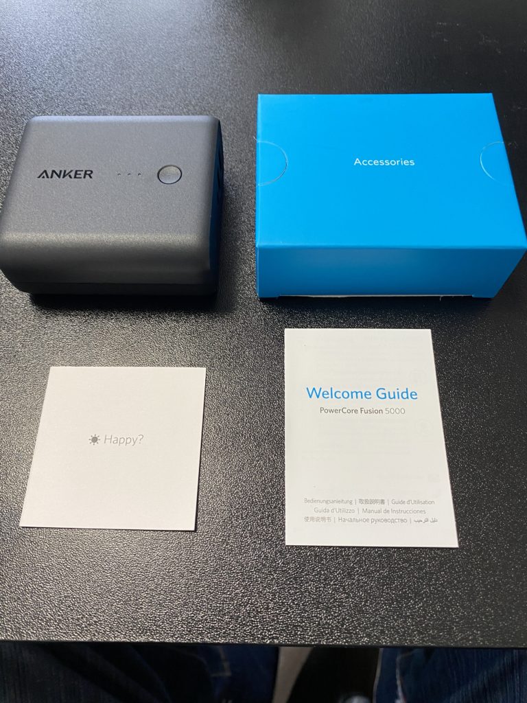 早々、開封して色々確認しました。本体と付属品箱、Welcome GuideとHappyカード(?)が入ってます。付属品箱の中身は、USB-A vs USB2.0-Bケーブルと携帯ポーチが入ってます。このモデルは、充電時は折りたたみのプラグとUSB2.0-Bの両方が使えます。そして、充電USBポートが2つあり、2つの機器を同時に充電可能です。