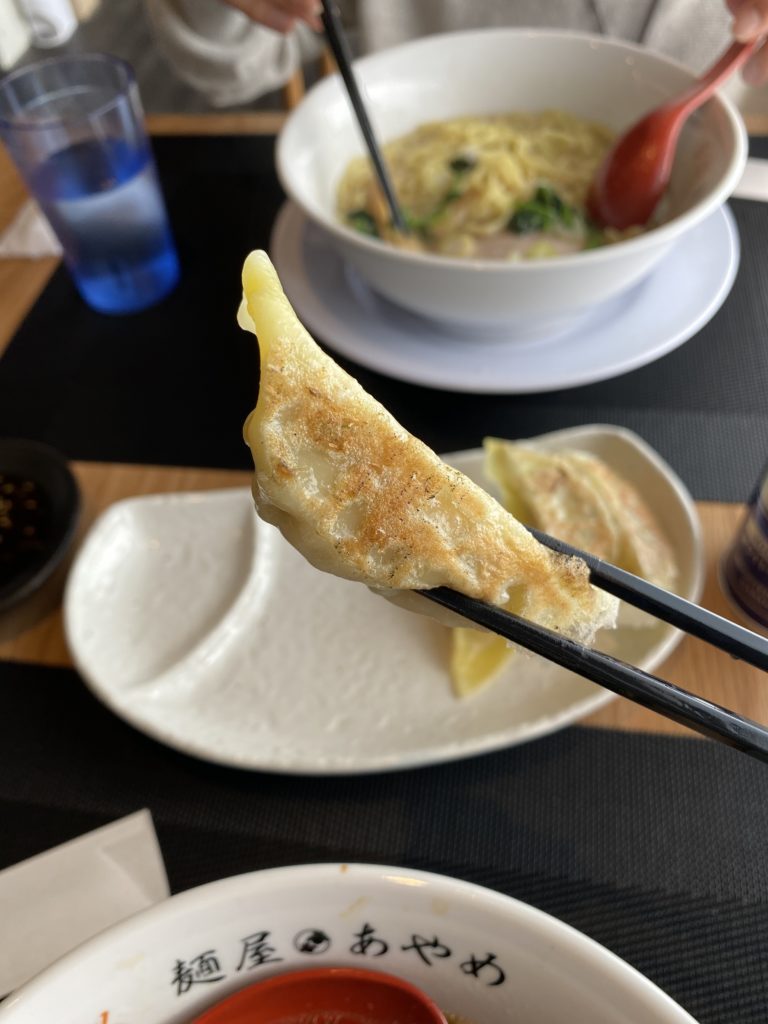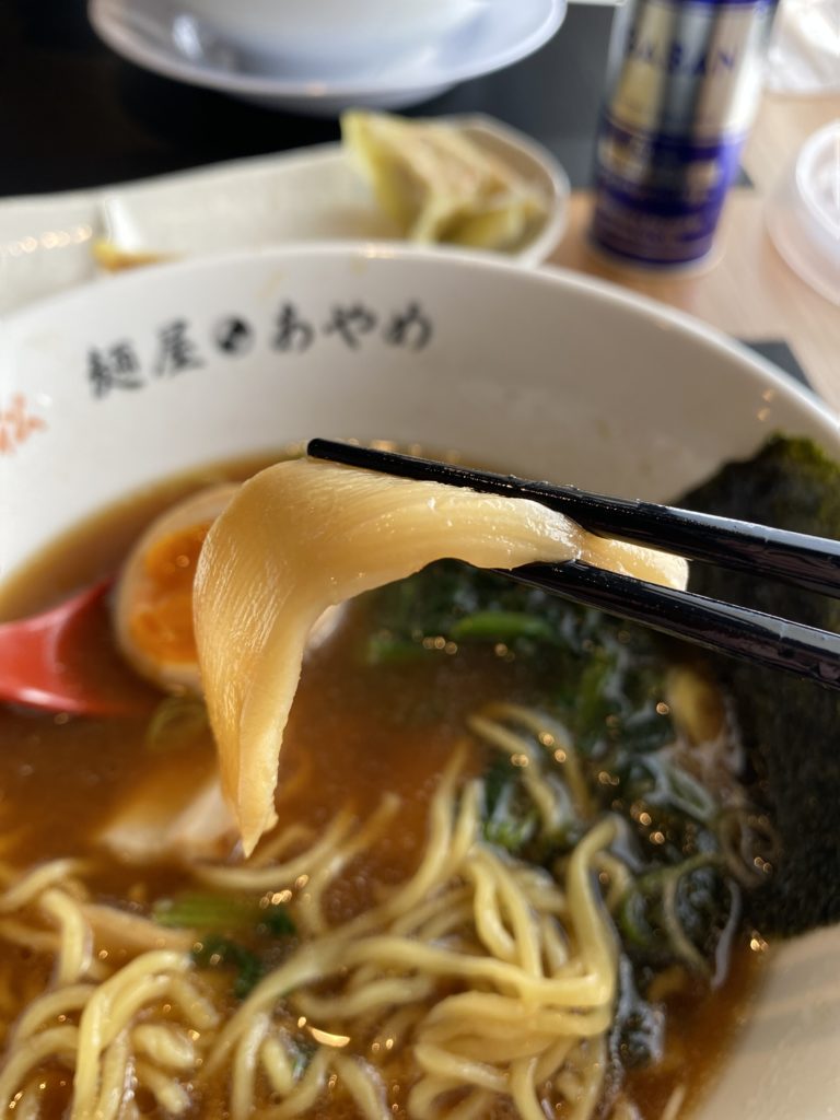 醤油も塩も非常に上品な感じです。生姜がひとつまみ乗ってます。あっさりとしたスープですが、生姜がアクセントでなかなか美味しい!! 口コミでは、長岡ラーメンを思い出すとかあるけど、確かに♪  餃子も生姜が効いていて、特製タレをつけて、パリパリ食感で美味しくいただきました!!